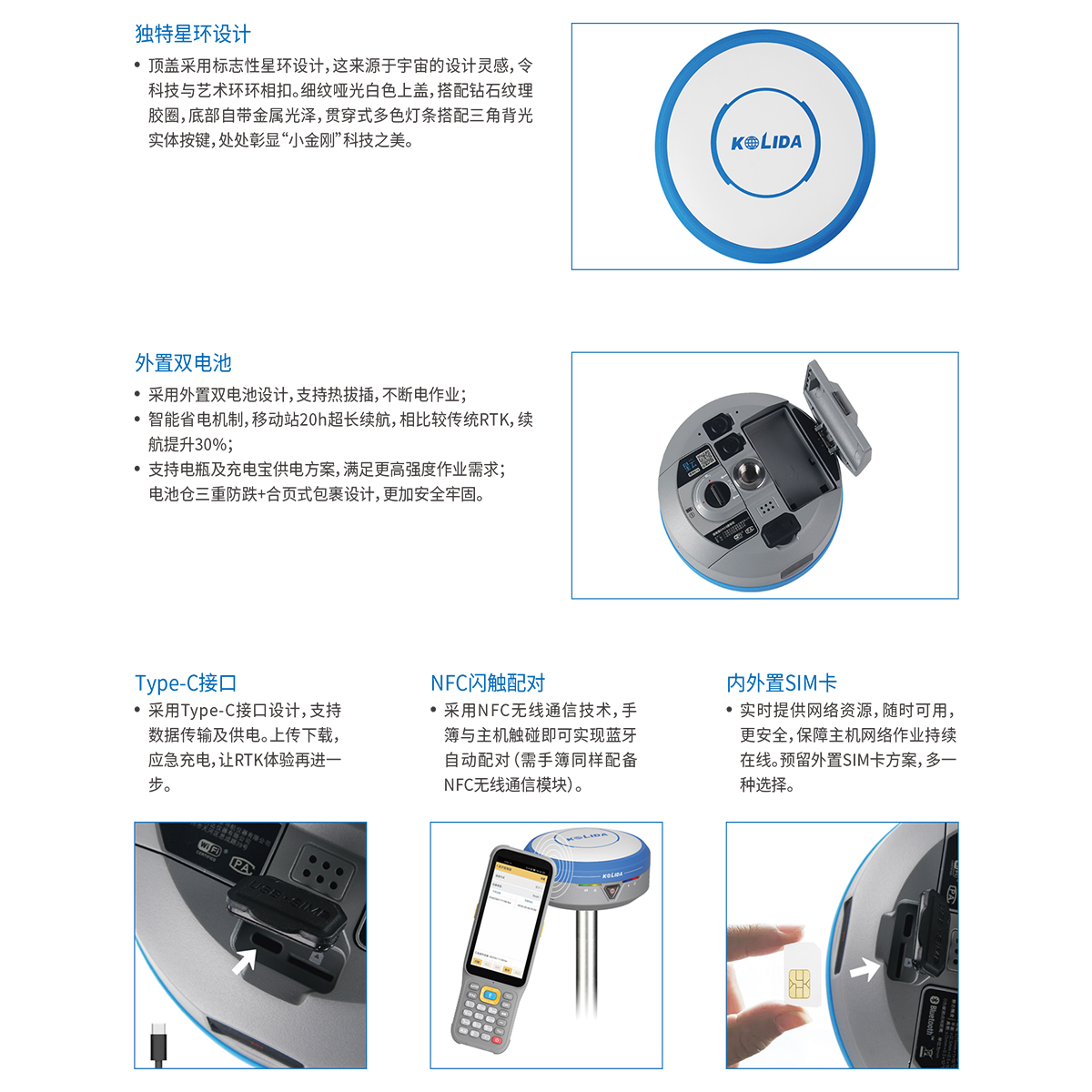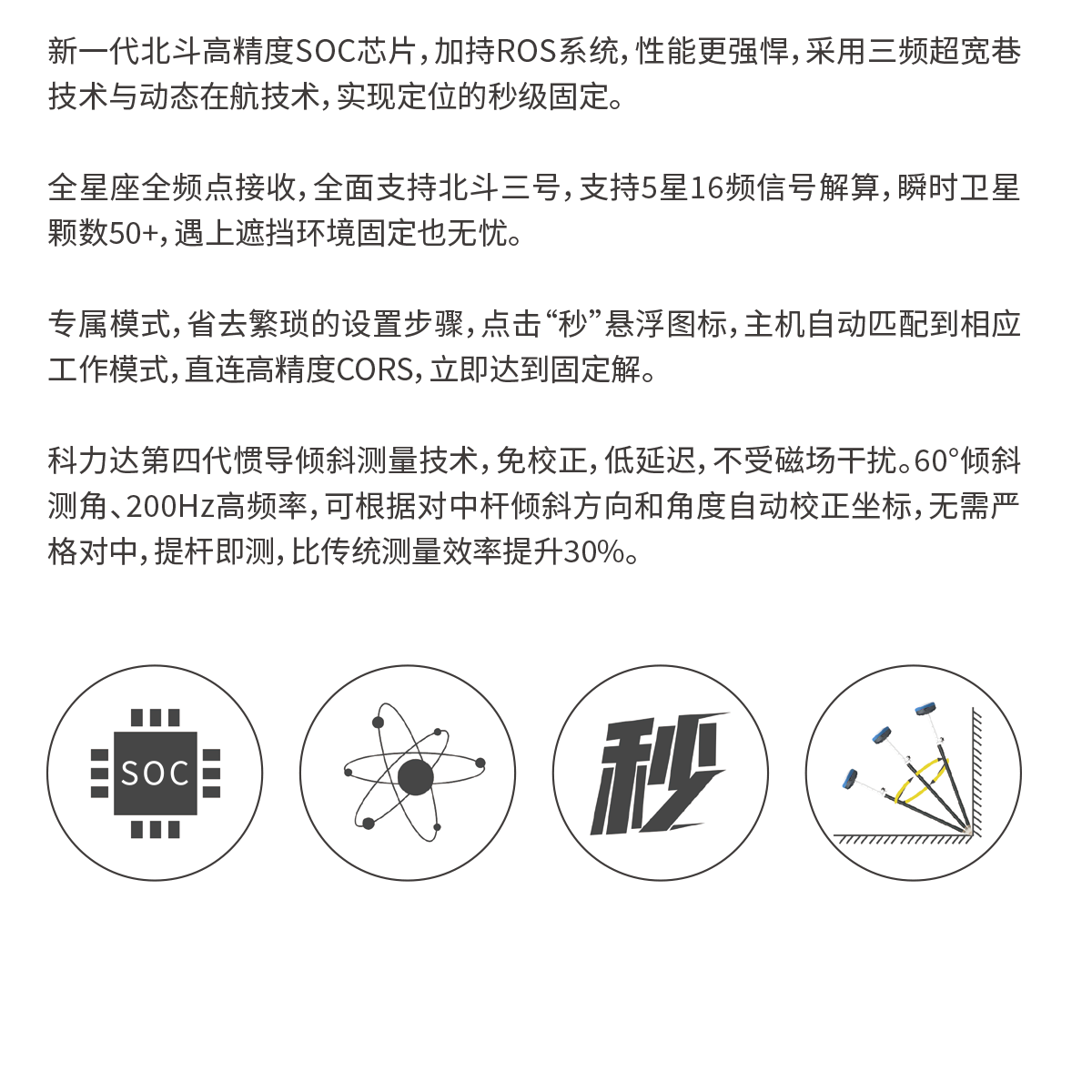 慣導傾斜測量 | 內置IMU慣性測量傳感器,支持慣導傾斜測量功能,根據對中桿傾斜方向和角度自動校正坐標。 |
