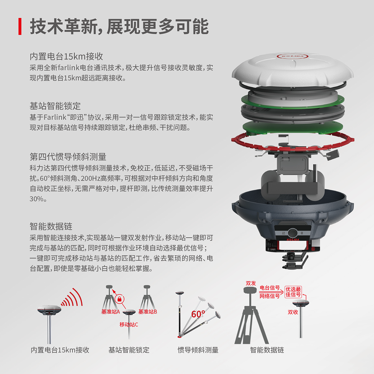 慣導傾斜測量 | 內置IMU慣性測量傳感器,支持慣導傾斜測量功能,根據對中桿傾斜方向和角度自動校正坐標。 |