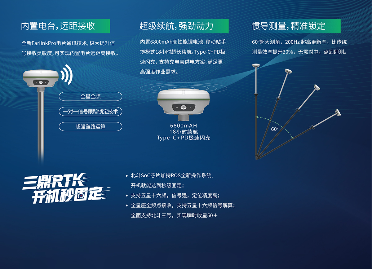慣導傾斜測量 | 內置IMU慣性測量傳感器,支持慣導傾斜測量功能,根據對中桿傾斜方向和角度自動校正坐標。 |
